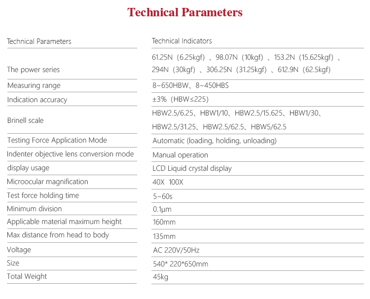Product OverviewMitech MHB-62.5 Digital Display Small Load Brinell Hardness Tester, based on the mechanical principle of hard alloy indenter pressing into the sample surface to produce indentation, realizing the material hardness measurement by measuring the diameter of the indentation. It’s MITECH latest optical mechanical and electrical integration of high-tech products. It is novel and high reliable with accurately measurement. With LED display, simple operation, it can visually display the test results to meet the hardness testing requirement for the quality control and qualified assessment of the workpiece sample. It is widely used in metal processing and manufacturing, various metal material’s failure analysis and other fields like colleges and research institutions.It is the new type Brinell hardness testing instrument for testing the hardness of the materials like cast iron, steel, soft alloy with small and thin sheet type workpiece and so on.