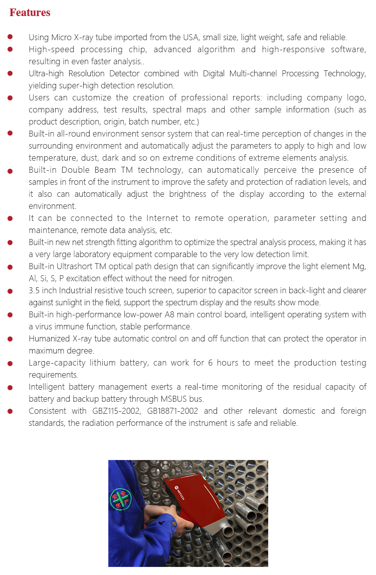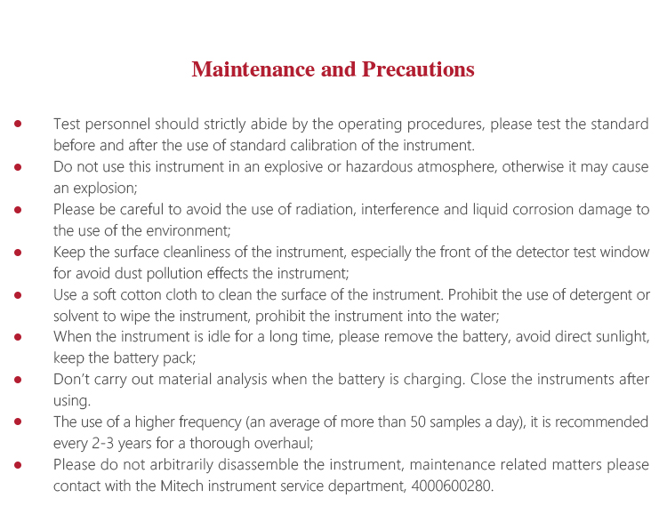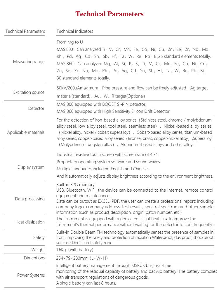 Product OverviewMITECH MAS800 Portable spectrometer, also called alloy analyzer. It adopts the principle of energy and wavelength differences in X-ray generated by metal atoms when energy level flips, so as to analysis element type and content in alloy material. Small size and light weight makes it convenient to work on site. It is easy to operate without tricky skills. A variety of elemental content can be measured at once in solid/powder/liquid sample detection. It is also designed with low consumption, high speed analysis and high accuracy; widely used in the field of analysis of elements such as boiler containers, petrochemical refining, iron and steel smelting, nonferrous metals, aerospace, weapons manufacturing and other elements that need to analyze Na or above to U. MAS 800 is a necessary professional precision instrument to improve the production efficiency and pass rate as well as cost savings.