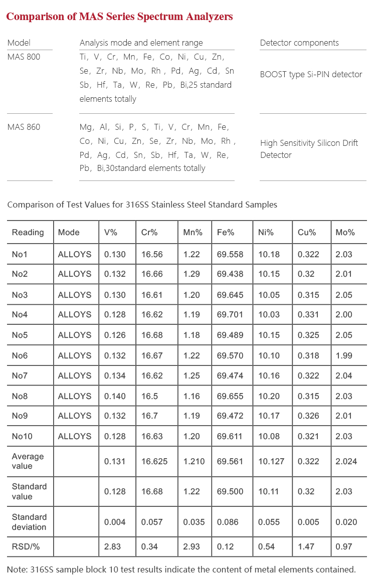 | Applicable materials | For the detection of iron-based alloy series(Stainless steel, chrome / molybdenum alloy steel, low a |