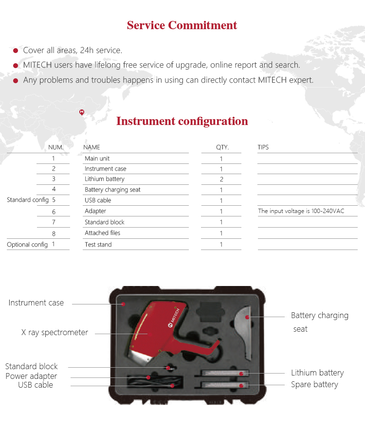 | Measuring range | From Mg to U Can analyzed Ti,V,Cr,Mn,Fe,Co,Ni,Cu,Zn,Se,Zr,Nb,Mo,Rh ,Pd,Ag,Cd,Sn,Sb,Hf,Ta,W,Re,Pb,B |