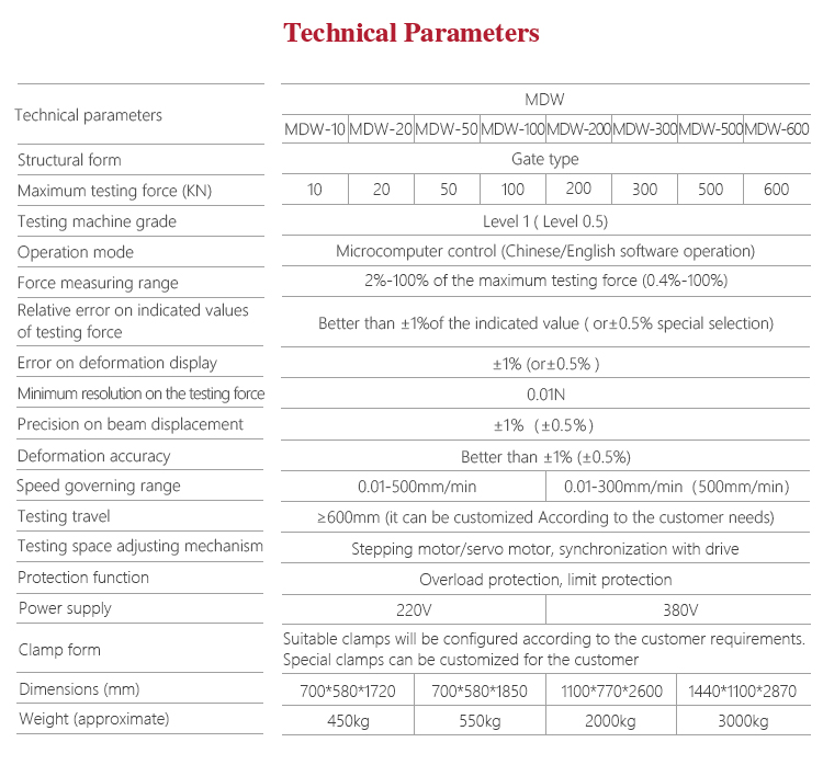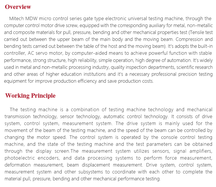 Product OverviewMitech MDW micro control series gate type electronic universal testing machine, through the computer control motor drive screw, equipped with the corresponding auxiliary for metal, non-metallic and composite materials for pull, pressure, bending and other mechanical properties test (Tensile test carried out between the upper beam of the main body and the moving beam. Compression and bending tests carried out between the table of the host and the moving beam). It’s adopts the built-in controller, AC servo motor, by computer-aided means to achieve powerful function with stable performance, strong structure, high reliability, simple operation, high degree of automation. It’s widely used in metal and non-metallic processing industry, quality inspection departments, scientific research and other areas of higher education institutions and it’s a necessary professional precision testing equipment for improve production efficiency and save production costs.