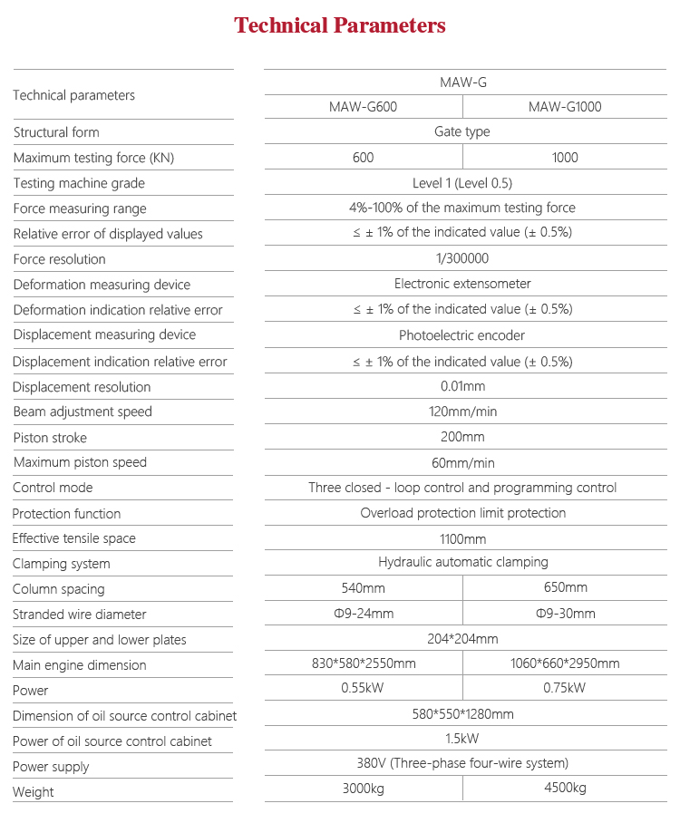 Mitech MAW-G micro control series of steel wire tensile testing machine, through the control of high-pressure pump to drive the screw movement, mainly for the prestressed steel strand tensile strength test and analysis. With manual and electro-hydraulic servo dual control mode, high precision gap sealing cylinder, digital processing, closed-loop control technology, it have stable performance, powerful, accurate data processing, strong structure, simple structure, high reliability, simple operation. It’s widely used in metal and non-metallic processing industry, quality inspection departments, scientific research and other areas of higher education institutions and it’s a necessary professional precision testing equipment for improve production efficiency and save production costs.