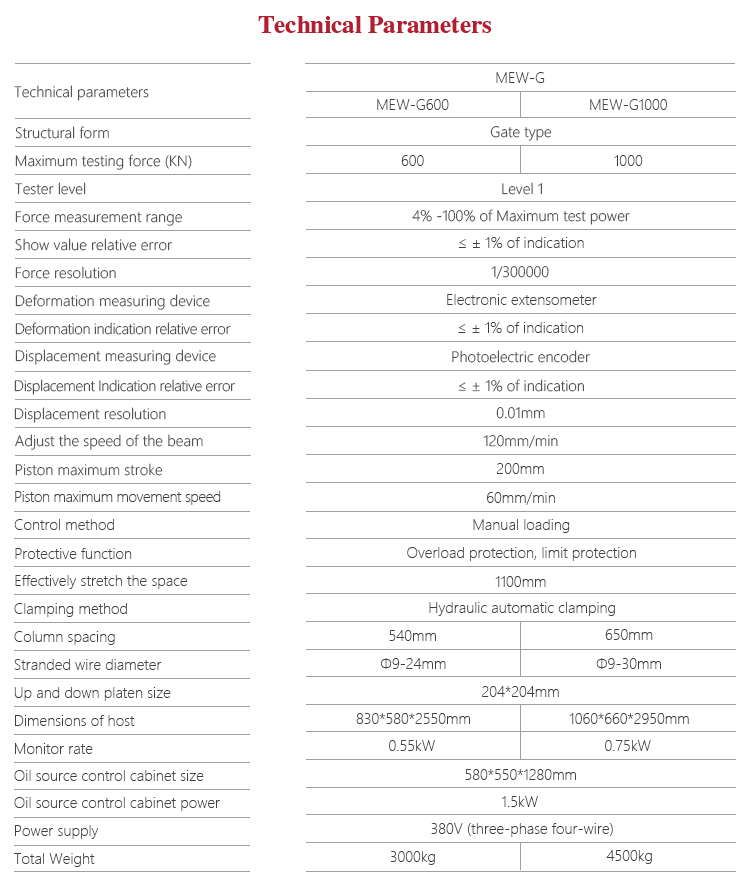 Product OverviewMitech MEW-G microcomputer screen series steel wire tensile testing machine,by controlling the high-pressure pump to drive the screw movement,mainly for the prestressed steel strand tensile strength test and analysis.It is characterized by high precision gap sealing cylinder, microcomputer display technology, digitized processing and high precision data acquisition and control technology. Its performance is stable, powerful, accurate data processing, strong structure, simple structure, high reliability, simple operation and friendly interface.Widely used in metal and non-metallic processing industry, quality inspection departments quality testing, scientific research and other areas of higher education institutions.It is the necessary professional precision testing equipment for improving production efficiency and saving production costs.