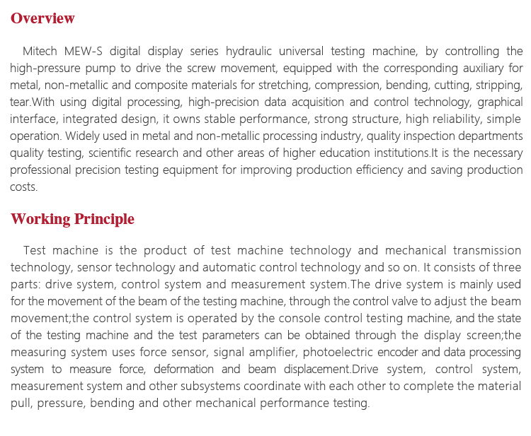 Mitech MEW-S digital display series hydraulic universal testing machine, by controlling the high-pressure pump to drive the screw movement, equipped with the corresponding auxiliary for metal, non-metallic and composite materials for stretching, compression, bending, cutting, stripping, tear.With using digital processing, high-precision data acquisition and control technology, graphical interface, integrated design, it owns stable performance, strong structure, high reliability, simple operation. Widely used in metal and non-metallic processing industry, quality inspection departments quality testing, scientific research and other areas of higher education institutions.It is the necessary professional precision testing equipment for improving production efficiency and saving production costs.