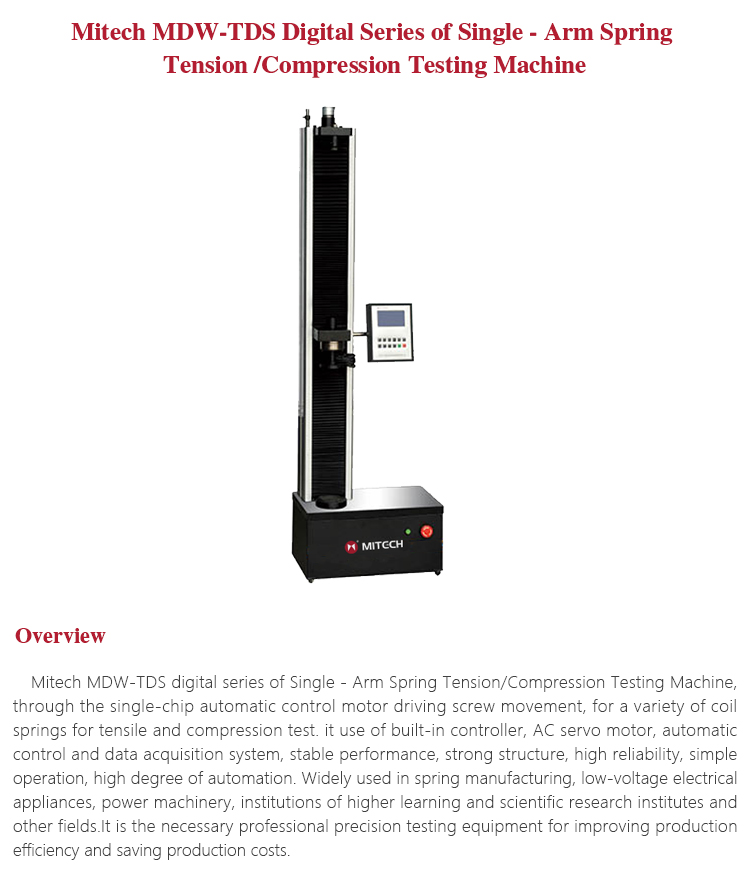 Product OverviewMitech MDW-TDS digital series of Single - Arm Spring Tension/Compression Testing Machine, through the single-chip automatic control motor driving screw movement, for a variety of coil springs for tensile and compression test. it use of built-in controller, AC servo motor, automatic control and data acquisition system, stable performance, strong structure, high reliability, simple operation, high degree of automation. Widely used in spring manufacturing, low-voltage electrical appliances, power machinery, institutions of higher learning and scientific research institutes and other fields.It is the necessary professional precision testing equipment for improving production efficiency and saving production costs.