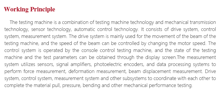 Working PrincipleThe testing machine is a combination of testing machine technology and mechanical transmission technology, sensor technology, automatic control technology. It consists of drive system, control system, measurement system. The drive system is mainly used for the movement of the beam of the testing machine, and the speed of the beam can be controlled by changing the motor speed. The control system is operated by the console control testing machine, and the state of the testing machine and the test parameters can be obtained through the display screen.The measurement system utilizes sensors, signal amplifiers, photoelectric encoders, and data processing systems to perform force measurement, deformation measurement, beam displacement measurement. Drive system, control system, measurement system and other subsystems to coordinate with each other to complete the material pull, pressure, bending and other mechanical performance testing.
