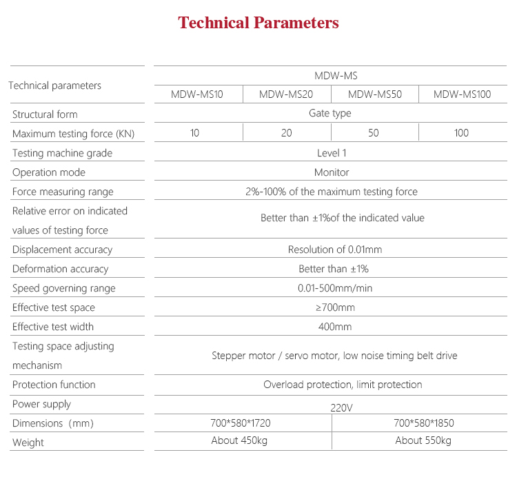 Product OverviewMitech MDW-MS series digital display artificial board universal testing machine, through the single-chip automatic control motor driving screw movement, can do various of physical and chemical properties of the test for wood-based panels and decorative panels. With built-in controller, AC servo motor, automatic control and data acquisition system, stable performance, strong structure, high reliability, simple operation, high degree of automation, it widely used in the wood-based panels and decorative panels of the internal bond strength, surface bonding strength, tensile strength test, bending test, elastic modulus test, grip force test and plywood shear cut test. It is a necessary professional precision testing equipment for improve production efficiency and save production costs.