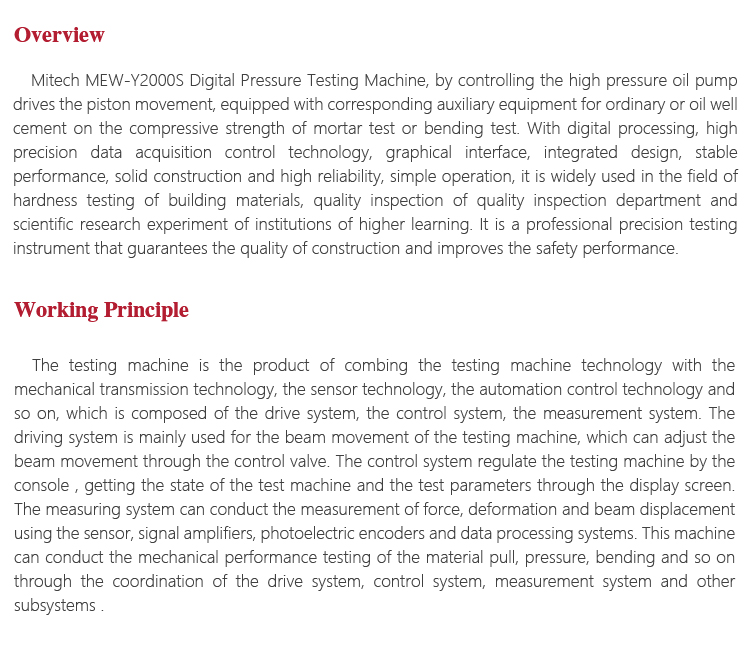 Product OverviewMitech MEW-Y2000S Digital Pressure Testing Machine, by controlling the high pressure oil pump drives the piston movement, equipped with corresponding auxiliary equipment for ordinary or oil well cement on the compressive strength of mortar test or bending test. With digital processing, high precision data acquisition control technology, graphical interface, integrated design, stable performance, solid construction and high reliability, simple operation, it is widely used in the field of hardness testing of building materials, quality inspection of quality inspection department and scientific research experiment of institutions of higher learning. It is a professional precision testing instrument that guarantees the quality of construction and improves the safety performance.