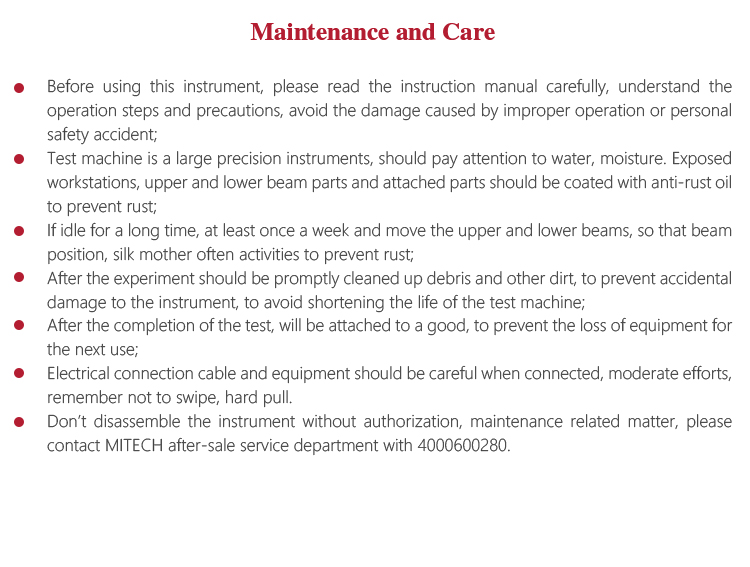 l Test machine is a large precision instruments, should pay attention to water, moisture. Exposed workstations, upper and lower beam parts and attached parts should be coated with anti-rust oil to prevent rust;
