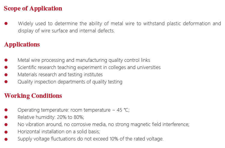 Instrument Featuresl Widely used to determine the ability of metal wire to withstand plastic deformation and display of wire surface and internal defects;