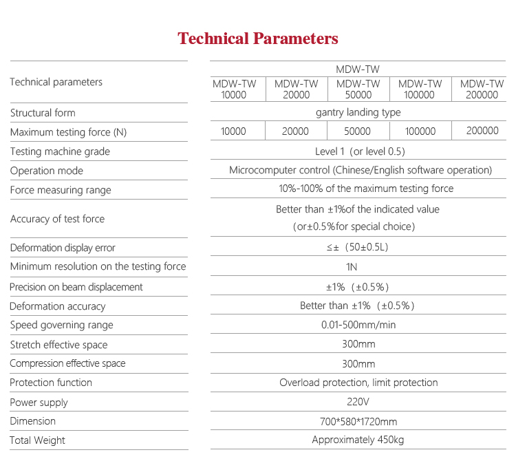 Product OverviewMitech MDW-TW micro-control series gantry landing type spring tension and compression testing machine,by microcomputer control motor drive screw motion, for a wide variety of spring tension and compression experiment was carried out, it adopts the built-in controller, AC servo motor, stable performance, strong structure, high reliability, simple operation and high degree of automation. Computer-aided means to achieve powerful functionality. Widely used in spring manufacturing, low-voltage electrical appliances, power machinery, institutions of higher learning and scientific research units and other fields.It is the necessary professional precision testing equipment for improving production efficiency and saving production costs.