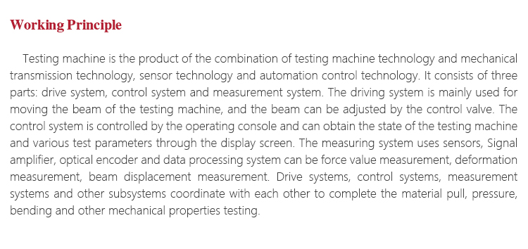 Working PrincipleTesting machine is the product of the combination of testing machine technology and mechanical transmission technology, sensor technology and automation control technology. It consists of three parts: drive system, control system and measurement system. The driving system is mainly used for moving the beam of the testing machine, and the beam can be adjusted by the control valve. The control system is controlled by the operating console and can obtain the state of the testing machine and various test parameters through the display screen. The measuring system uses sensors, Signal amplifier, optical encoder and data processing system can be force value measurement, deformation measurement, beam displacement measurement. Drive systems, control systems, measurement systems and other subsystems coordinate with each other to complete the material pull, pressure, bending and other mechanical properties testing.
