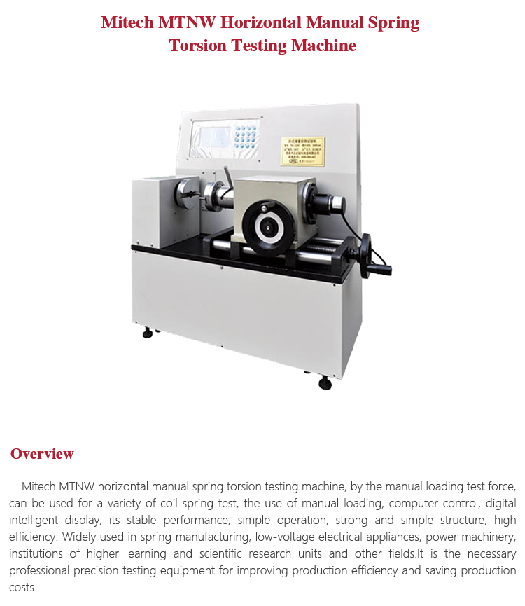 Product OverviewMitech MTNW horizontal manual spring torsion testing machine, by the manual loading test force, can be used for a variety of coil spring test, the use of manual loading, computer control, digital intelligent display, its stable performance, simple operation, strong and simple structure, high efficiency. Widely used in spring manufacturing, low-voltage electrical appliances, power machinery, institutions of higher learning and scientific research units and other fields.It is the necessary professional precision testing equipment for improving production efficiency and saving production costs.