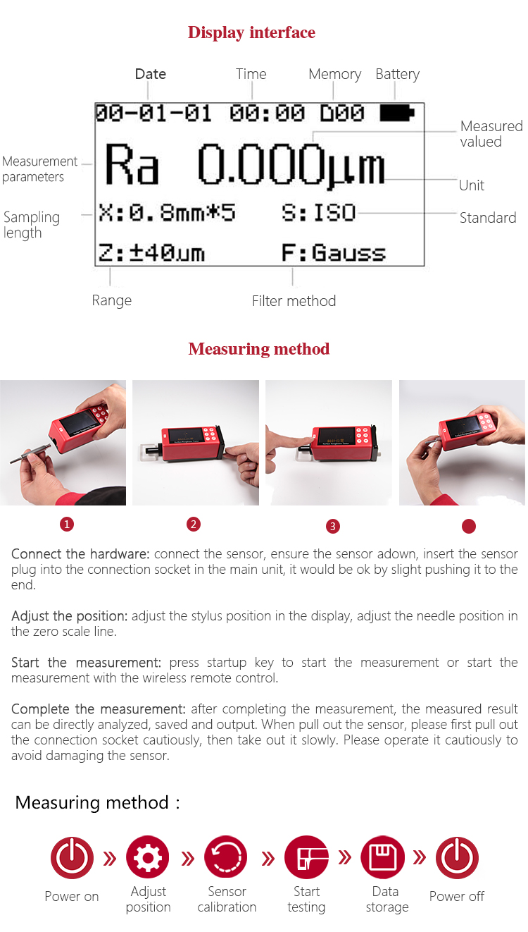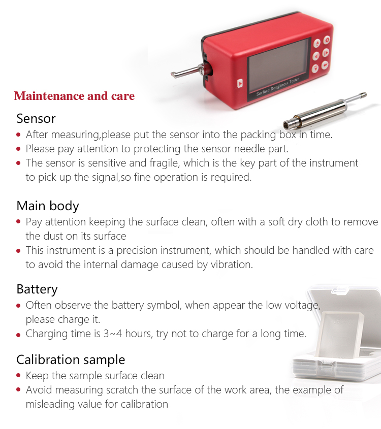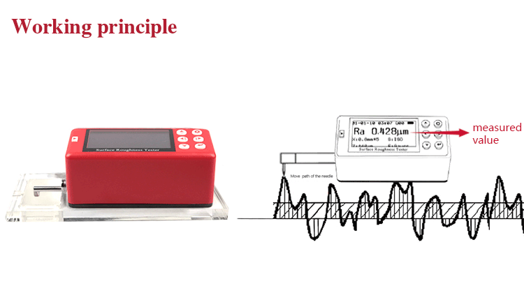 When measuring roughness of part surface, the probe is placed on the surface of the part and then tracing the surface at constant rate. The probe acquires the surface roughness by the sharp stylus in probe. The roughness causes displacement of probe which results in change of inductive value of induction coils thus generate analogue signal which is in proportion to surface roughness at output end of phase-sensitive rectifier. This signal enters data collection system after amplification and level conversion. After that, those collected data are processed with digital filtering and parameter calculation by ARM chip and the measuring result can be read on OLED display. The results can be printed by Bluetooth printer.