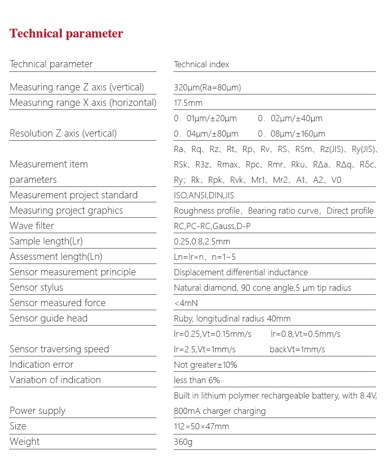 | Measurement range: | Z Axis(Vertical)320μm(Ra=80μm),X Axis(Horizontal)17.5mm |