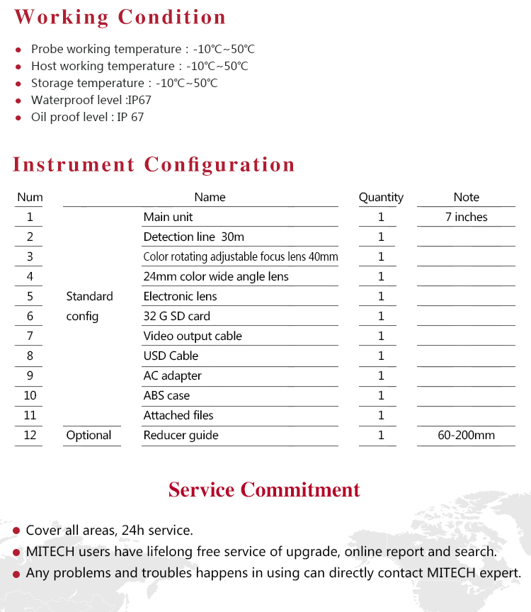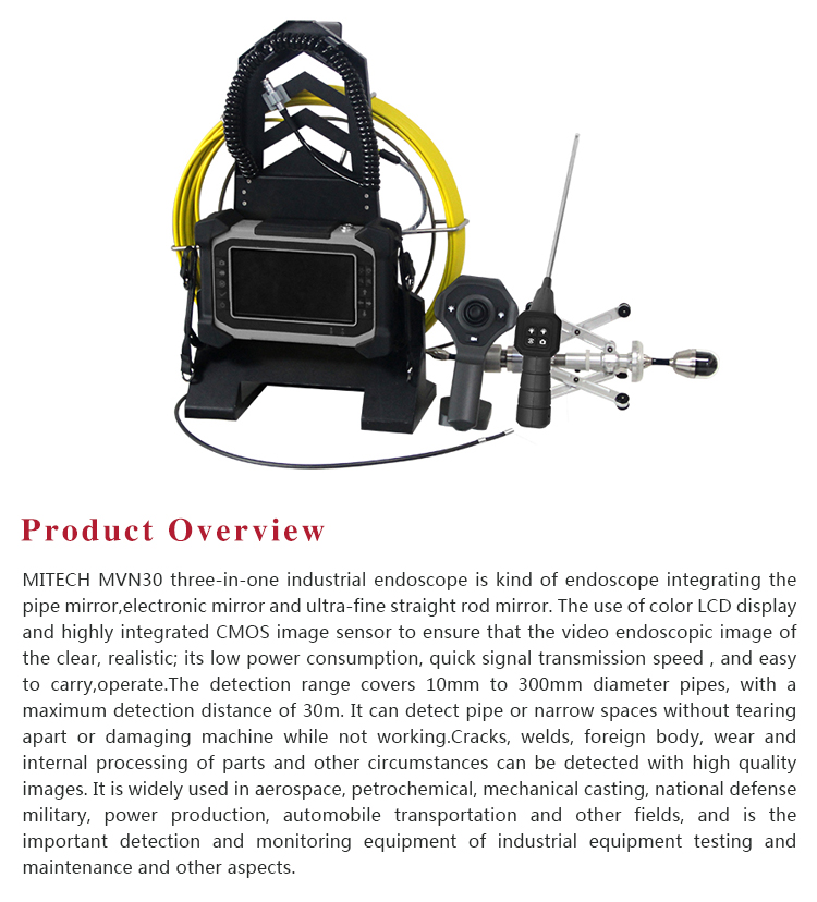 Product OverviewMITECH MVN30 three-in-one industrial endoscope is kind of endoscope integrating the pipe mirror,electronic mirror and ultra-fine straight rod mirror. The use of color LCD display and highly integrated CMOS image sensor to ensure that the video endoscopic image of the clear, realistic; its low power consumption, quick signal transmission speed , and easy to carry,operate.The detection range covers 10,, to 300mm diameter pipes, with a maximum detection distance of 30m. It can detect pipe or narrow spaces without tearing apart or damaging machine while not working.Cracks, welds, foreign body, wear and internal processing of parts and other circumstances can be detected with high quality images. It is widely used in aerospace, petrochemical, mechanical casting, national defense military, power production, automobile transportation and other fields, and is the important detection and monitoring equipment of industrial equipment testing and maintenance and other aspects.