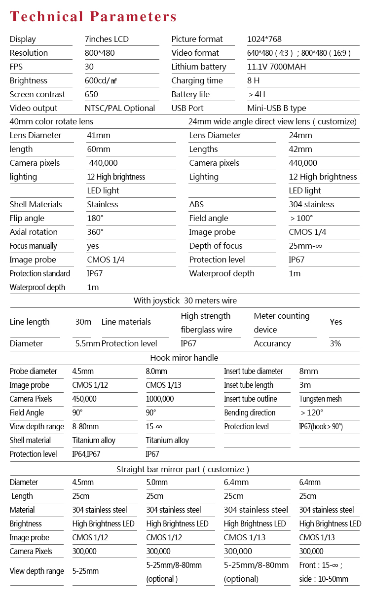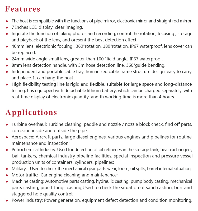 Instrument Featuresl The host is compatible with the functions of pipe mirror, electronic mirror and straight rod mirror.