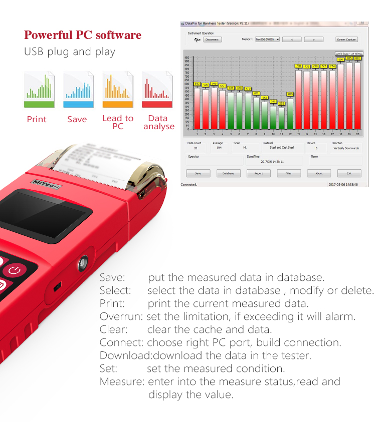 l USB interface can do transmission measurements, the measured value storage management, statistical analysis of the measured value, the measured value of the print report and batch set the instrument parameters through the PC data processing software, to meet the higher demand for quality assurance and management.