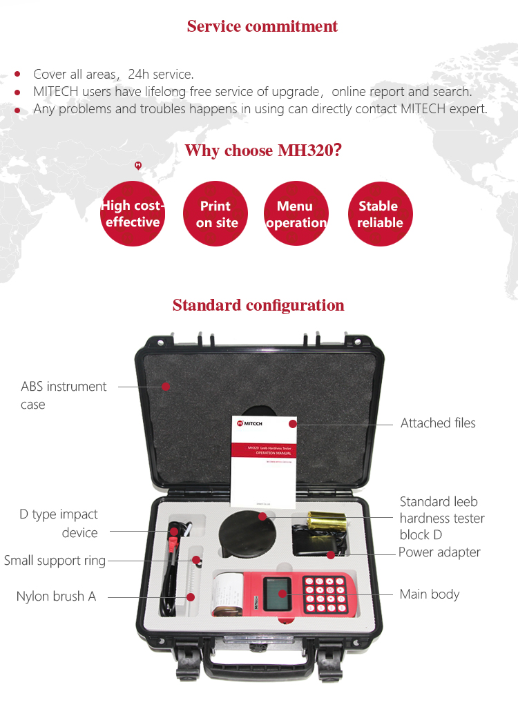 Product OverviewMH320 portable Leeb hardness tester is based on Leeb hardness measurement principle, it can be quickly and easily used for on-site testing hardness of metallic materials and support free conversion between Leeb, Brinell, Rockwell hardness and other scales. It uses 128 × 64 dot matrix LCD screen, rich information, intuitive, stable performance and integrated high-speed thermal printer, which enables printing with instant measurement results.It can be widely used in metal processing and manufacturing, special equipment, permanent component failure analysis, inspection and other fields. It is particularly suitable for large parts and non-removable part of the on-site hardness testing. It is to improve production efficiency and pass rate and is a wise choice to save the cost of production.