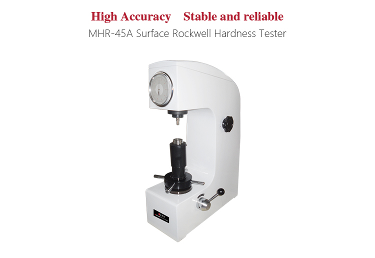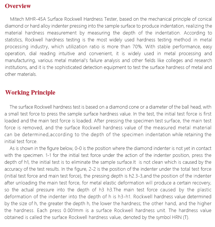 Product OverviewMitech MHR-45A Surface Rockwell Hardness Tester, based on the mechanical principle of conical diamond or hard alloy indenter pressing into the sample surface to produce indentation, realizing the material hardness measurement by measuring the depth of the indentation. According to statistics, Rockwell hardness testing is the most widely used hardness testing method in metal processing industry, which utilization ratio is more than 70%. With stable performance, easy operation, dial reading intuitive and convenient, it is widely used in metal processing and manufacturing, various metal material’s failure analysis and other fields like colleges and research institutions, and it is the sophisticated detection equipment to test the surface hardness of metal and other materials.