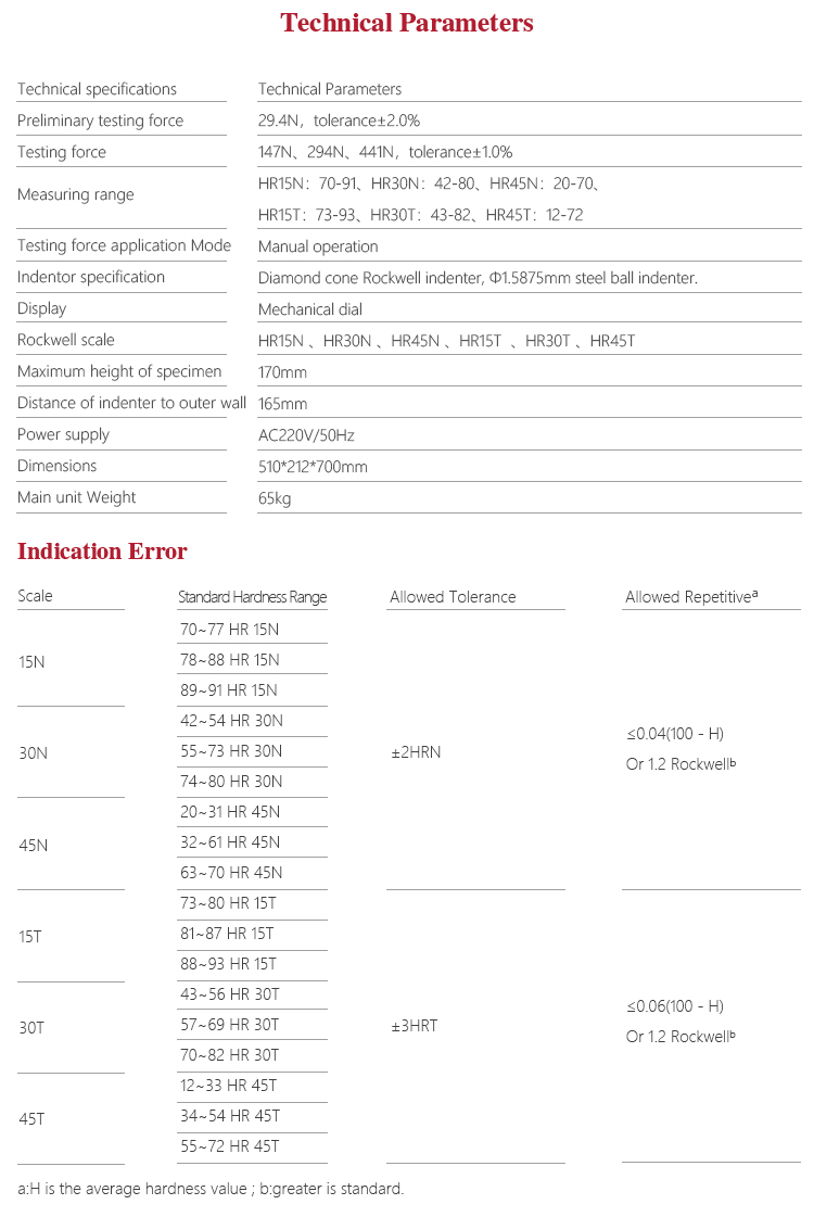 | Indentor specification | Diamond cone Rockwell indenter, Φ1.5875mm steel ball indenter. |