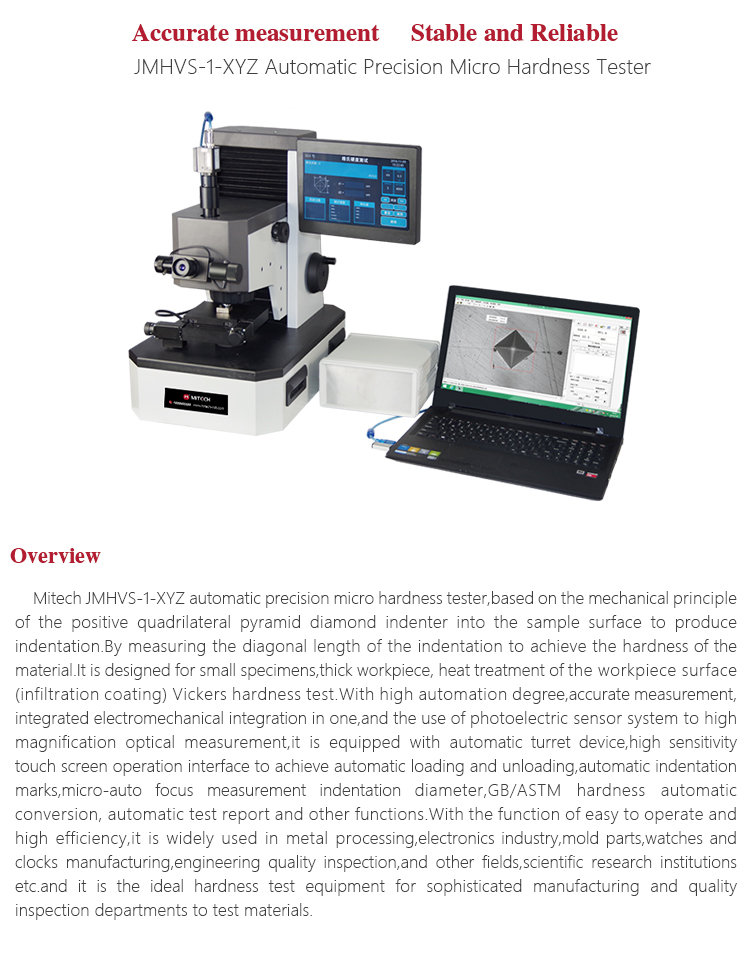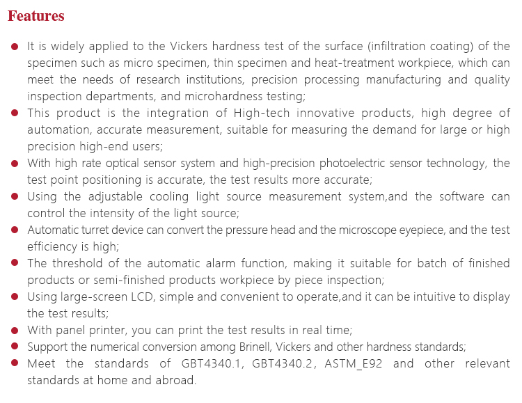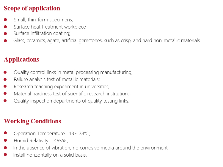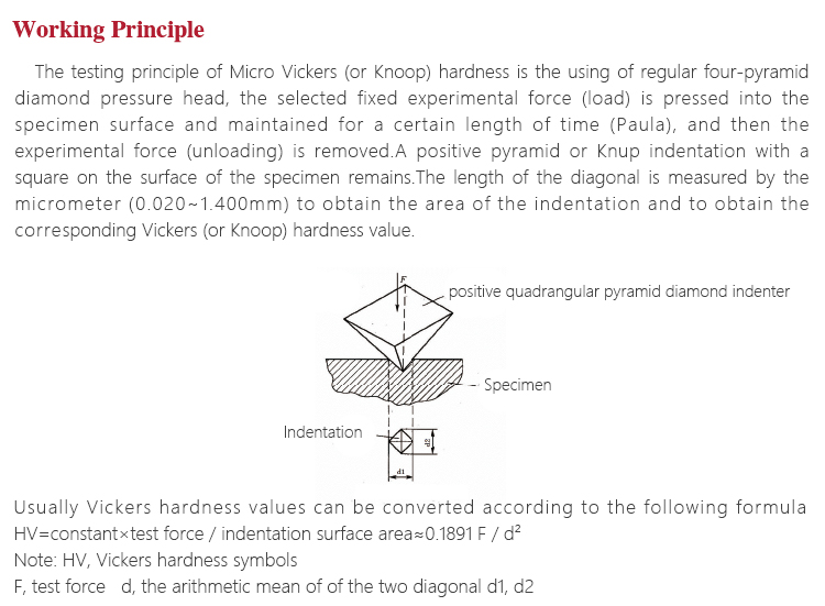 Working PrincipleThe testing principle of Micro Vickers (or Knoop) hardness is the using of regular four-pyramid diamond pressure head, the selected fixed experimental force (load) is pressed into the specimen surface and maintained for a certain length of time (Paula), and then the experimental force (unloading) is removed.A positive pyramid or Knup indentation with a square on the surface of the specimen remains.The length of the diagonal is measured by the micrometer (0.020~1.400mm) to obtain the area of the indentation and to obtain the corresponding Vickers (or Knoop) hardness value.