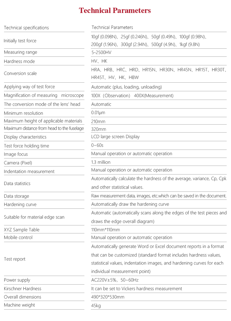 | Measuring range | 5-2500HV |