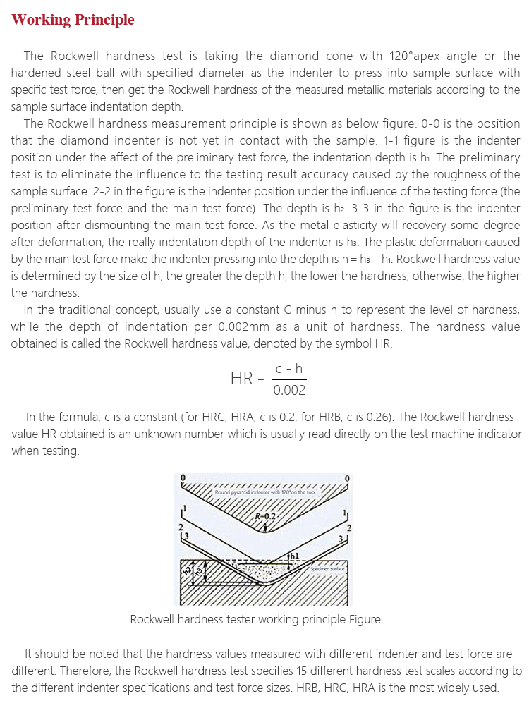 Working PrincipleThe Rockwell hardness test is taking the diamond cone with 120°apex angle or the hardened steel ball with specified diameter as the indenter to press into sample surface with specific test force, then get the Rockwell hardness of the measured metallic materials according to the sample surface indentation depth.