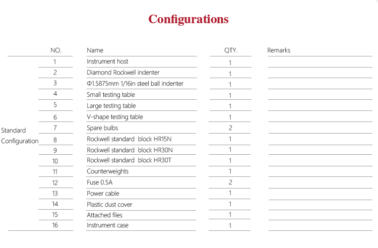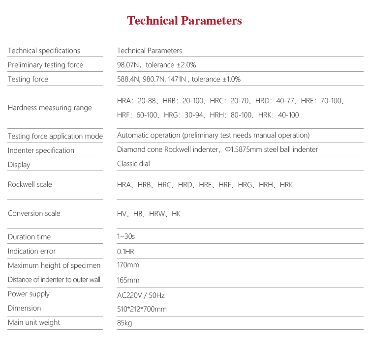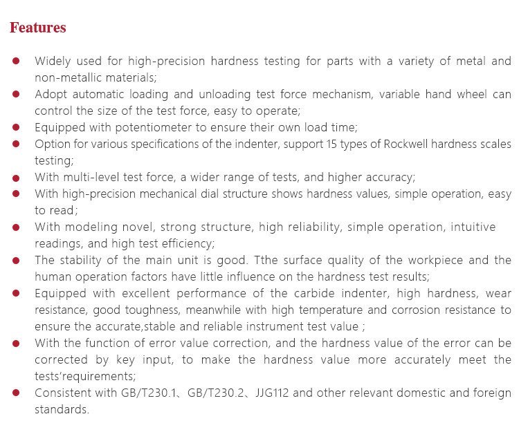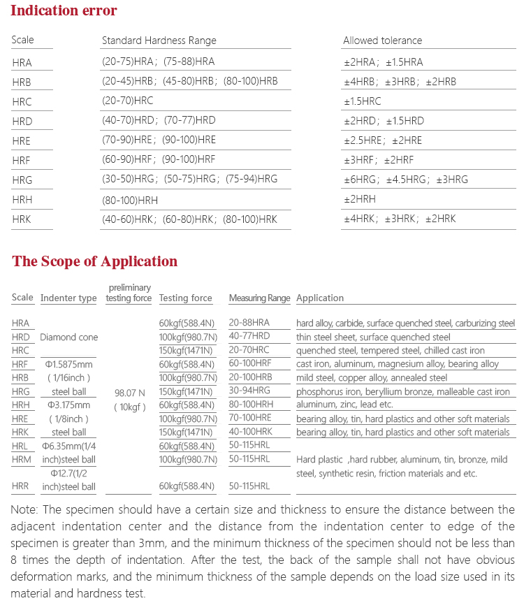 | Hardness measuring range | HRA:20-88、HRB:20-100、HRC:20-70、HRD:40-77、 HRE:70-100、HRF:60-100、HRG:30-94、HRH:80-100、 HRK:40-100 |