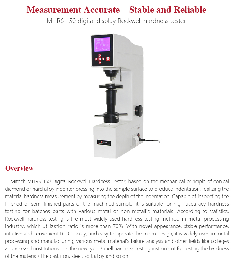 Product OverviewMitech MHRS-150 Digital Rockwell Hardness Tester, based on the mechanical principle of conical diamond or hard alloy indenter pressing into the sample surface to produce indentation, realizing the material hardness measurement by measuring the depth of the indentation. Capable of inspecting the finished or semi-finished parts of the machined sample, it is suitable for high accuracy hardness testing for batches parts with various metal or non-metallic materials. According to statistics, Rockwell hardness testing is the most widely used hardness testing method in metal processing industry, which utilization ratio is more than 70%. With novel appearance, stable performance, intuitive and convenient LCD display, and easy to operate the menu design, it is widely used in metal processing and manufacturing, various metal material’s failure analysis and other fields like colleges and research institutions. It is the new type Brinell hardness testing instrument for testing the hardness of the materials like cast iron, steel, soft alloy and so on.