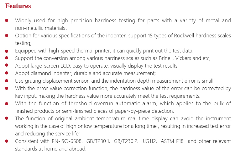 l Consistent with EN-ISO-6508、GB/T230.1、GB/T230.2、JJG112、ASTM E18 and other relevant standards at home and