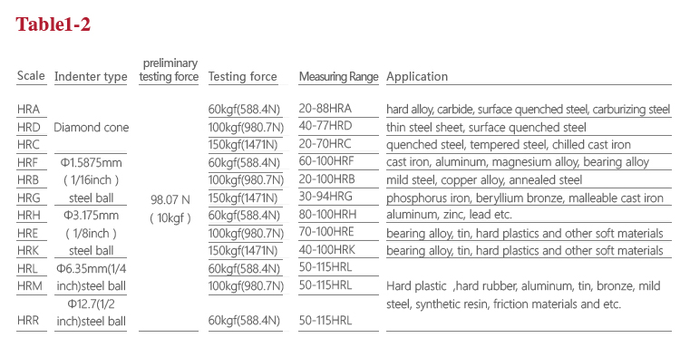 It should be noted that the measured hardness values would be different with different indenter and test force. Therefore, the Rockwell hardness testing specifies 15 different hardness test scales according to the different indenter