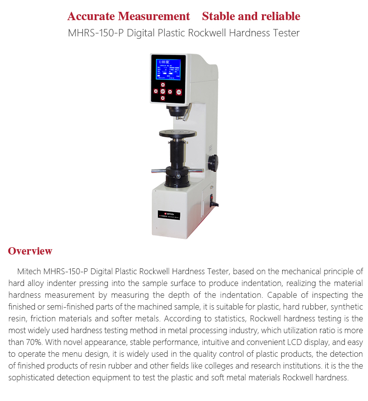 Product OverviewMitech MHRS-150-P Digital Plastic Rockwell Hardness Tester, based on the mechanical principle of hard alloy indenter pressing into the sample surface to produce indentation, realizing the material hardness measurement by measuring the depth of the indentation. Capable of inspecting the finished or semi-finished parts of the machined sample, it is suitable for plastic, hard rubber, synthetic resin, friction materials and softer metals. According to statistics, Rockwell hardness testing is the most widely used hardness testing method in metal processing industry, which utilization ratio is more than 70%. With novel appearance, stable performance, intuitive and convenient LCD display, and easy to operate the menu design, it is widely used in the quality control of plastic products, the detection of finished products of resin rubber and other fields like colleges and research institutions. it is the the sophisticated detection equipment to test the plastic and soft metal materials Rockwell hardness.