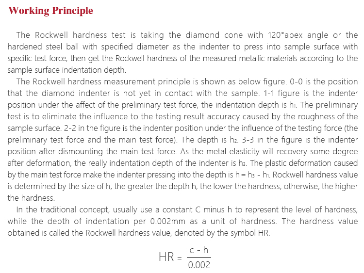 The Rockwell hardness measurement principle is shown as below figure. 0-0 is the position that the diamond indenter is not yet in contact with the sample. 1-1 figure is the indenter position under the affect of the preliminary test force, the indentation depth is h1. The preliminary test is to eliminate the influence to the testing result accuracy caused by the roughness of the sample surface. 2-2 in the figure is the indenter position under the influence of the testing force (the preliminary test force and the main test force). The depth is h2. 3-3 in the figure is the indenter position after dismounting the main test force. As the metal elasticity will recovery some degree after deformation, the really indentation depth of the indenter is h3. The plastic deformation caused by the main test force make the indenter pressing into the depth is h=h3-h1. Rockwell hardness value is determined by the size of h, the greater the depth h, the lower the hardness, otherwise, the higher the hardness.