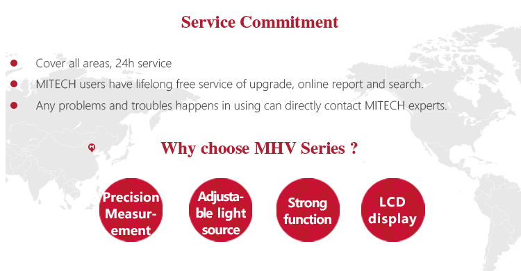 Product OverviewMitech MHV series vickers hardness tester, based on the principle that positive quadrangular pyramid diamond indenter presses the surface of the sample to produce indentation.By measuring the diagonal length of the indentation to achieve the measurement of the hardness of the material can be for small specimens, thin specimens, surface coating, heat treatment of the workpiece surface Vickers hardness test. With stable performance, strong structure, high reliability, simple operation, adopt high magnification optical measurement system, adjust the cold light source, photoelectric sensing technology and computer-aided means it has a powerful function. It is widely used in the fields of metal processing, electronics industry, mold parts, watch manufacturing, engineering quality inspection and so on. It is an ideal hardness tester for material research and testing.