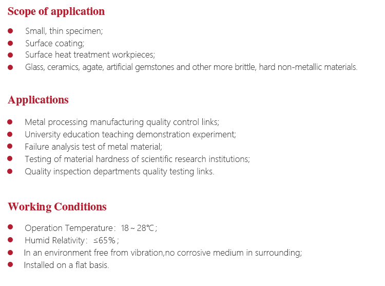 Working PrincipleMicro-Vickers (or Knoop) hardness test principle is that put the provisions of the positive pyramid diamond indenter into the sample surface(with fixed experimental force) and maintain a certain length (holding), and then unloading. Finally, there is a positive quadrangular pyramid or kenup indentation with a square surface on the surface of the specimen. Then we can attain the area of indentation via measuring the length of the diagonal by a micrometer eyepiece. Then the corresponding Vickers (or Knoop) hardness values are obtained.
