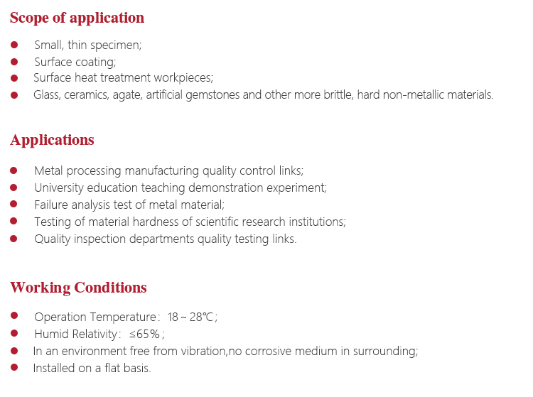 Working PrincipleMicro-Vickers (or Knoop) hardness test principle is that put the provisions of the positive pyramid diamond indenter into the sample surface(with fixed experimental force) and maintain a certain length (holding), and then unloading. Finally, there is a positive quadrangular pyramid or kenup indentation with a square surface on the surface of the specimen. Then we can attain the area of indentation via measuring the length of the diagonal by a micrometer eyepiece. Then the corresponding Vickers (or Knoop) hardness values are obtained.