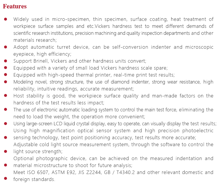 l Meet ISO 6507, ASTM E92, JIS Z2244, GB / T4340.2 and other relevant domestic and foreign standards.
