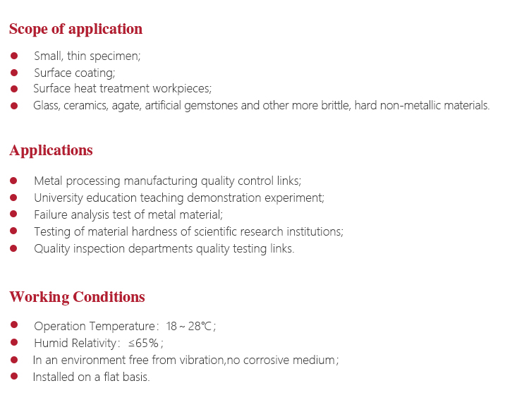 Instrument FeaturesWidely used in micro-specimen, thin specimen, surface coating, heat treatment of workpiece surface samples and etc.Vickers hardness test to meet different demands of scientific research institutions, precision machining and quality inspection departments and other materials research;