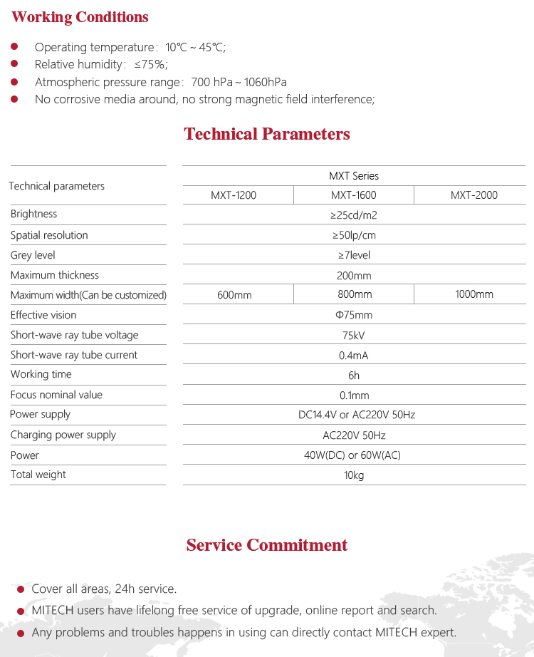 Mitech MXT series portable belt flaw detector, based on short wave radiography principle, use flat-type image intensifier, built-in high-voltage generator and SD memory card to achieve a convenient belt non-destructive testing and data storage records. Its performance is stable, high sensitivity, clear imaging and easy operation, with real-time imaging, camera storage and other functions. Effective for coal mining enterprises mining equipment (belt) testing, it is a professional non-destructive testing equipment to save production costs, eliminate the necessary hidden dangers.