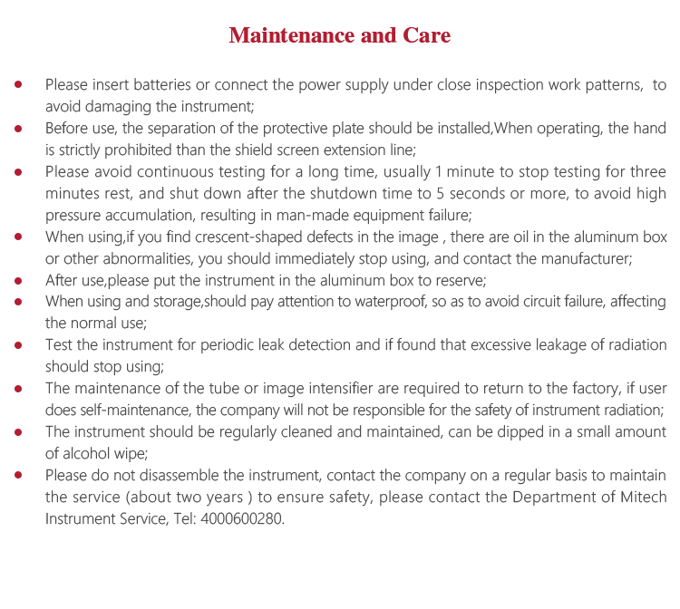 <!--[if !supportLists]-->l <!--[endif]-->The maintenance of the tube or image intensifier are required to return to the factory, if user does self-maintenance, the company will
