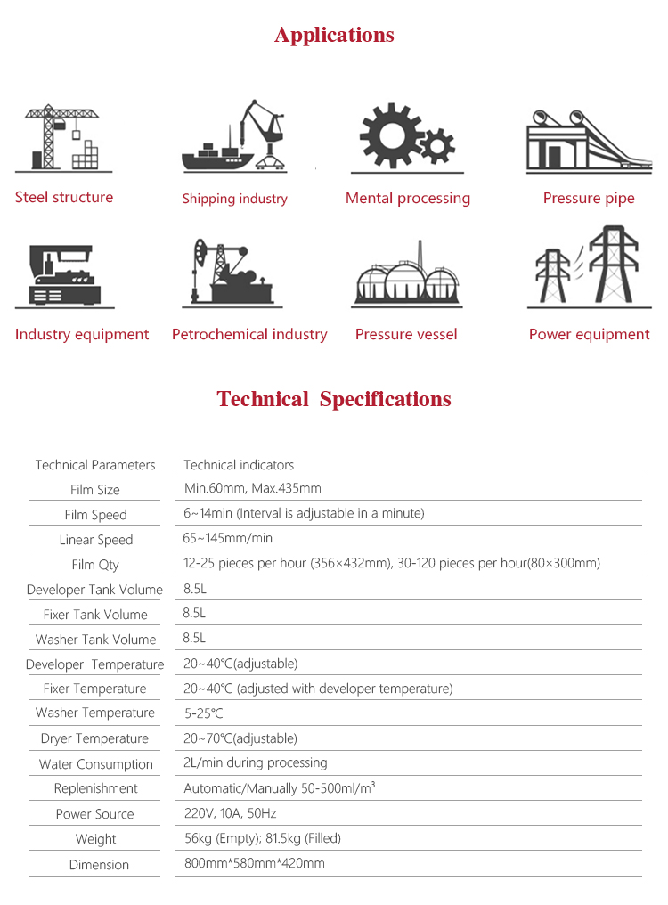 The temperature of developer and dryer is adjustable to ensure film dried and brightly and improve the work efficiency.
