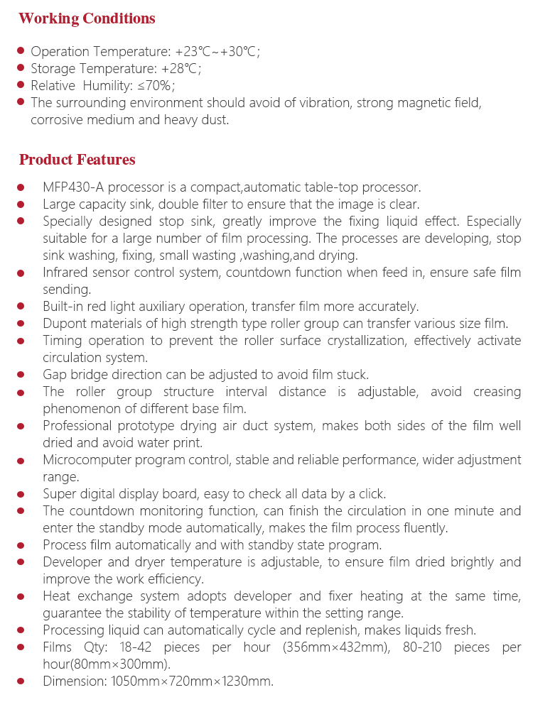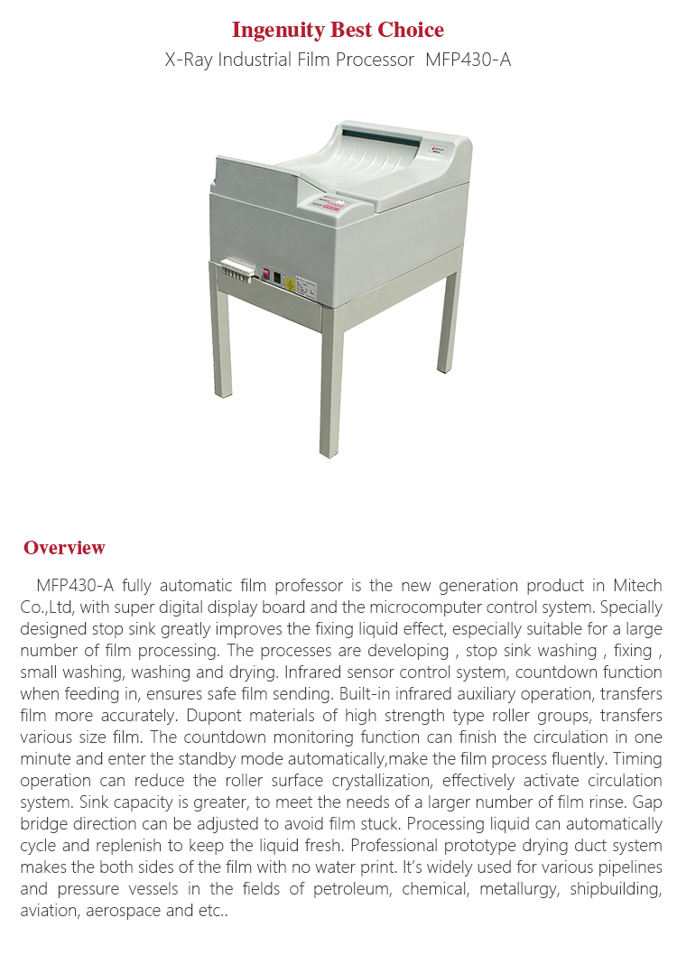 Product OverviewMFP430-A fully automatic film professor is the new generation product in Mitech Co.,Ltd, with super digital display board and the microcomputer control system. Specially designed stop sink greatly improves the fixing liquid effect, especially suitable for a large number of film processing. The processes are developing , stop sink washing , fixing , small washing, washing and drying. Infrared sensor control system, countdown function when feeding in, ensures safefilm sending. Built-in infrared auxiliary operation, transfers film more accurately. Dupont materials of high strength type roller groups, transfers various size film. The countdown monitoring function can finish the circulation in one minute and enter the standby mode automatically,make the film process fluently. Timing operation can reduce the roller surface crystallization, effectively activate circulation system. Sink capacity is greater, to meet the needs of a larger number of film rinse. Gap bridge direction can be adjusted to avoid film stuck. Processing liquid can automatically cycle and replenish to keep the liquid fresh. Professional prototype drying duct system makes the both sides of the film with no water print. It’s widely used for various pipelines and pressure vessels in the fields of petroleum, chemical, metallurgy, shipbuilding, aviation, aerospace and etc.