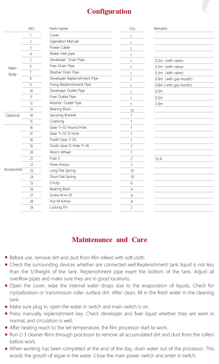 The four processes have high requirements for the temperature, time and liquid concentrations in developer and fixer. Film process has four modes, cold, preheating, wash and self-inspection. Under cold mode, system is on electricity but not work. Under preheating mode, working area starts to heat to certain temperature without film. When the film enters in, temperature goes up rapidly to wash film. Wash mode means film is under washing. Under self-inspection, it can check whether each component is working normally.