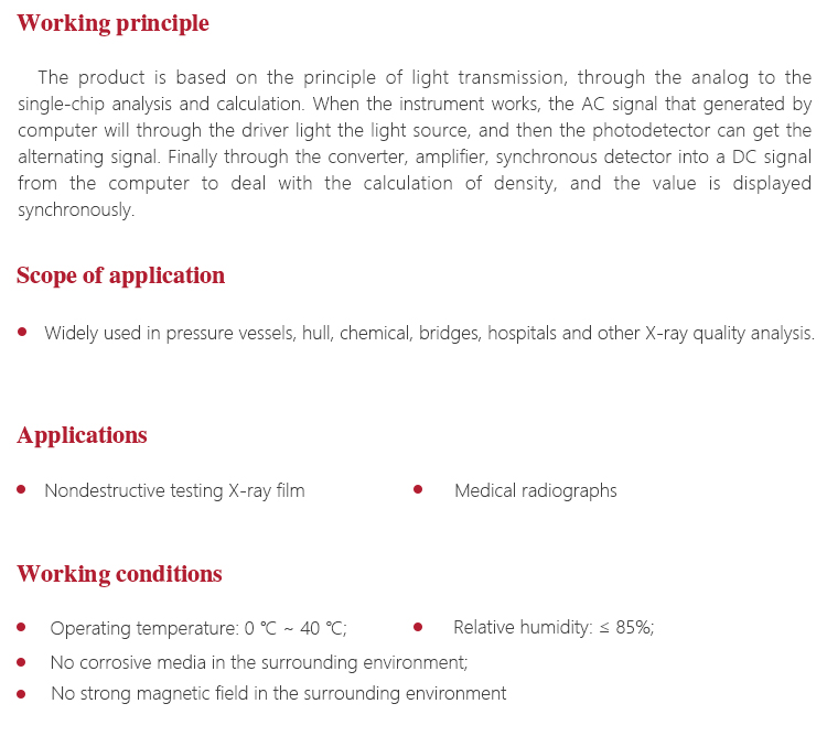 The product is based on the principle of light transmission, through the analog to the single-chip analysis and calculation. When the instrument works, the AC signal that generated by computer will through the driver light the light source, and then the photodetector can get the alternating signal. Finally through the converter, amplifier, synchronous detector into a DC signal from the computer to deal with the calculation of density, And the value is displayed synchronously.