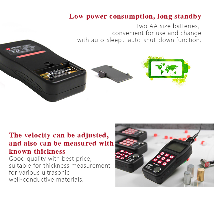 Mitech series ultrasonic thickness gauges, with low-power design and long standby, MT150/MT160/MT200/MT180/MT190/MT600/MT660 are with two AA size alkaline batteries for power supply, easy to replace.