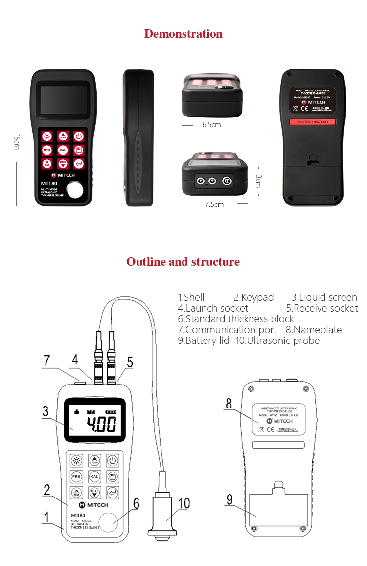 Product OverviewMiteh MT180 multi-mode ultrasonic thickness gauge, based on ultrasonic measuring principle, it can perform thickness measurements on a wide range of materials including metals, plastic, ceramics glass and other ultrasonic well-conductive materials. It is also capable for measuring the sound velocity of the object with known thickness. Compared with the traditional measurement method, the advantage of ultrasonic thickness gauge is that it can finish the measurement only if it contacts with one side of the measured workpiece. Its unique performance of capable for testing thickness through the coating provides efficient solution for testing the workpiece of coated surface or corrosion materials. It can test the workpiece directly without needing to get rid of the surface coating. It’s widely used for monitoring the production equipments’ various pipelines and pressure vessel corrosion reducing degree in the fields of petroleum, chemical, metallurgy, shipbuilding, aviation, aerospace and so on. It also can be used for making accurate measurement to various plates and machining parts. It is the necessary professional precision instrument for improving the production efficiency and qualification rate as well as saving cost.