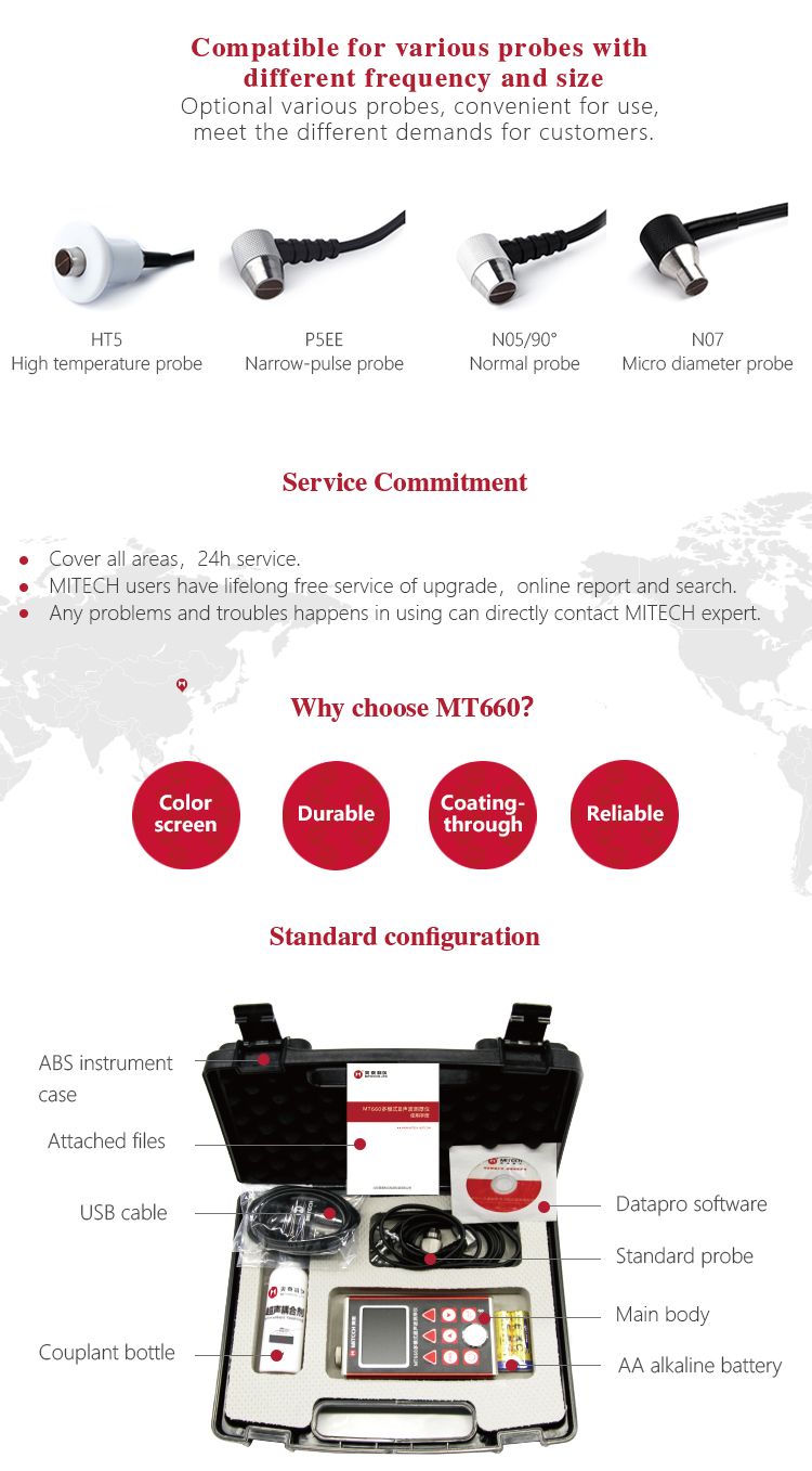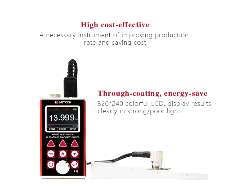 Product OverviewMT660 multi-mode ultrasonic thickness gauge is the newest promoted upgraded product by Mitech. It pays more attention to user experience and functional innovation. Adopted with 320*240 colorful LCD display, it can show you clear measurement result under dim light and strong sunshine environment, improved the visual experience greatly. Sealed aluminum-magnesium alloy case delicate design, smaller volume, better quality are specially designed for defense against oil, dust in the bad sit environment. With intelligent warning function, it will promote automatically when beyond the setting range, it is convenient for reading. It can meet the efficient collecting material’s multiple points’ thickness accurate testing demand. It supports 0.001 high accuracy display and Bluetooth communication. With through coating mode and common mode, its unique performance of capable for testing thickness through the coating provides efficient solution for testing the workpiece of coated surface or corrosion materials. It can measure the workpiece directly without needing to get rid of the surface coating before measurement. It’s widely used for monitoring the production equipments’ various pipelines and pressure vessel corrosion reducing degree in the fields of petroleum, chemical, metallurgy, shipbuilding, aviation, aerospace and so on. It also can be used for making accurate measurement to various plates and machining parts. It is the necessary professional precision instrument for improving the production efficiency and qualification rate as well as saving cost.