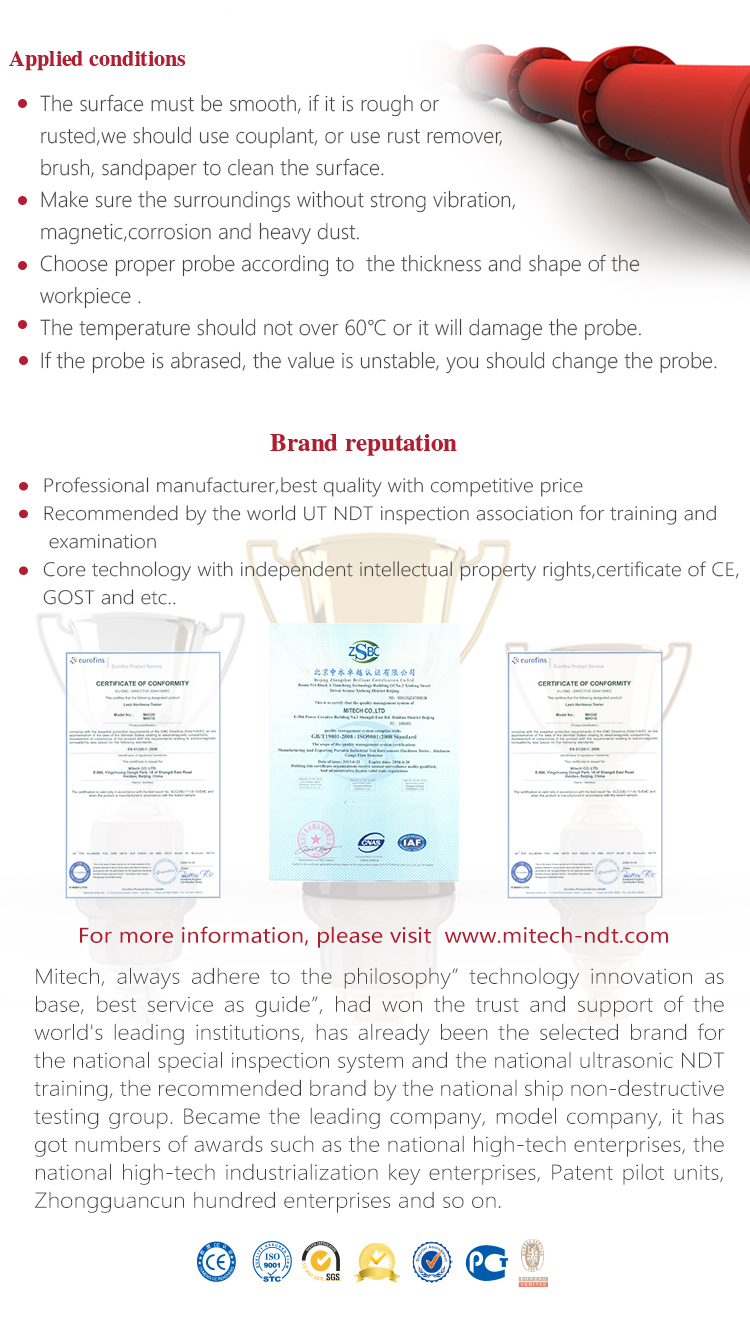 The couplant coated on the probe and the measured workpiece surface as the medium to isolate the air between them, selecting the proper viscosity couplant is the critical thing for the precisely measurement. Mitech series ultrasonic thickness gauge standard 75mm ultrasonic special couplant in the configuration for isolating the air between the ultrasonic probe and the workpiece surface, which can make probe produced ultrasonic wave into the workpiece effectively to ensure the accurate measurement of thickness. The couplant with squeeze bottle packing, it is clean and environmental. It is recommended to select the low viscosity couplant for measuring the smooth material and select the high viscosity couplant (like glycerine cream, butter and so on) for measuring the rough material.