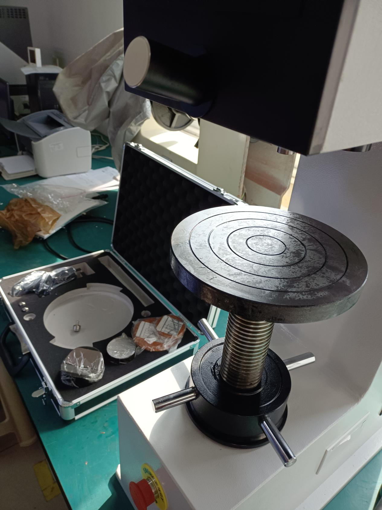 美泰MHBS-3000Z配備了三個測量載臺以適配不同大小、不同形狀工件的測量。工程師詳細(xì)講解了如何對儀器進(jìn)行校零,測量以及打印。首先把工件放在平臺上,通過手動旋轉(zhuǎn)把工件提高到最接近壓頭的位置。點(diǎn)擊啟動按鈕,儀器會自動運(yùn)行加荷,保荷和卸荷,卸荷完成后,塔臺自動轉(zhuǎn)動,將測量物鏡轉(zhuǎn)到待測壓痕正上方,通過測量目鏡測量出壓痕直徑,D1\D2,點(diǎn)擊測量按鈕,儀器自動測量出被測工件的布氏硬度,并自動轉(zhuǎn)化出所對應(yīng)的洛氏、維氏等硬度值。